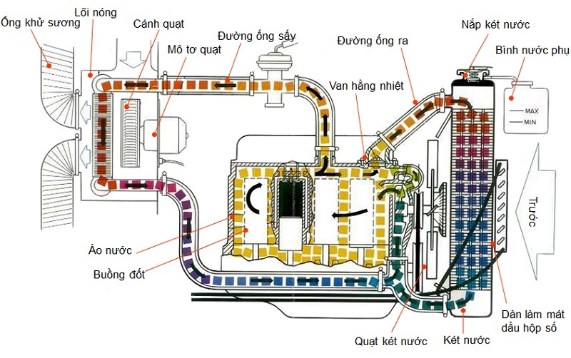 Hệ thống làm mát là tập hợp các chi tiết phụ tùng cùng làm 1 nhiệm vụ là giải nhiệt cho động cơ, hộp số khi nóng và chống đông khi thời tiết quá lạnh.