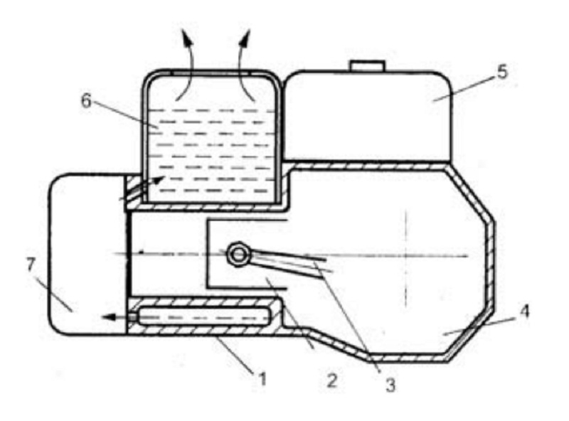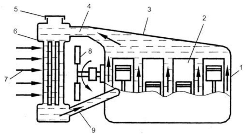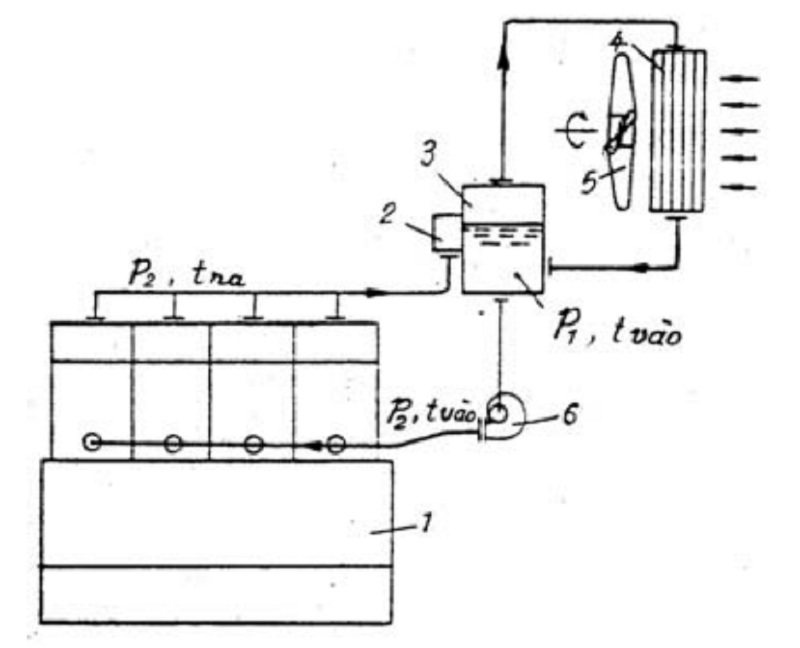 1. Động cơ; 2. Van tiết lưu; 3. Bộ tách hơi; 4. Bộ ngưng tụ hơi nước 5. Quạt gió; 6. Bơm nước.