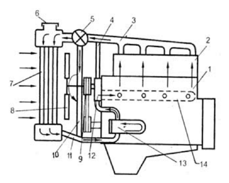 1. Thân máy; 2. Nắp xi lanh; 3. Đường nước ra khỏi động cơ; 4 ống dẫn bọt nước; 5. Van hằng nhiệt; 6.Nắp rót nước; 7. Két làm mát ; 8. Quạt gió ; 9. Puly ; 10. Ống nước nối tắt vào bơm ; 11. Đường nước vào động cơ ; 12. Bơm nước ; 13. Két làm mát đầu ; 14. Ống phân phối nước