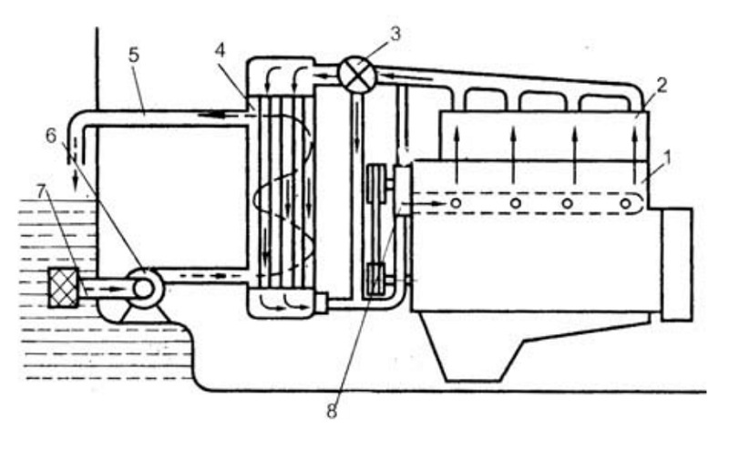 Trong động cơ tàu thuỷ, có thế dùng hai kiểu tuần hoàn làm mát: hệ thống làm mát kiểu một vòng tuần hoàn hở và hệ thống làm mái cưỡng bức kiểu hai vỏng.