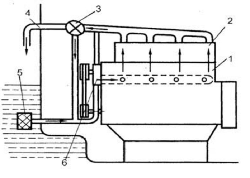 Hệ thống làm mát kiểu một vỏng hở bán chất không khác nhiều so với hệ thống làm mát cưỡng bức vòng kín. Trong hệ thống này (hình: 7.5) nước làm mát là nước sông, nước biến, được bơm 6 hút vào làm mát động cơ sau đó theo đường nước 4 đố ra sông, biển. Ưu điểm cơ bản của hệ thống này là đơn giản.