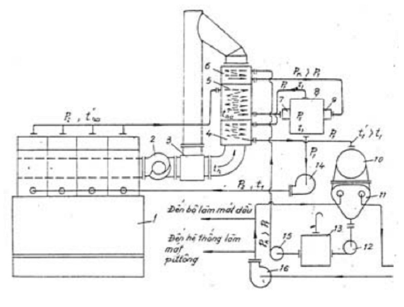 1. Động cơ; 2. Tuốc bin tăng áp ; 3. Đường thải; 4.Bộ tăng nhiệt cho hơi nước; 5. Bộ tăng nhiệt cho nước ra; 6. Bộ tăng nhiệt cho nước trước khi vào bộ tách hơi; 7,9. Van tiết lưu; 8. Bộ tách hơi; 10. Tuốc bin hơi; 11. Bộ ngưng tụ; 12,14,15,16. Bơm nước; 13.