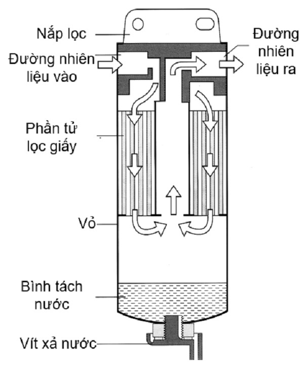 Các loại động cơ diesel được trang bị lọc nhiên liệu có hệ thống tách nước. Do vậy phải định kỳ xả nước ra khỏi lọc hoặc khi đèn cảnh báo có nước sáng trên bảng táp lô. Hãy mở vít xả nước ở dưới đáy bầu lọc nhiên liệu. Nếu không thấy nước chảy ra hãy mở nút xả e ở bên trên bầu lọc. Hãy tra cứu Hướng dẫn sửa chữa để có thêm thông tin.