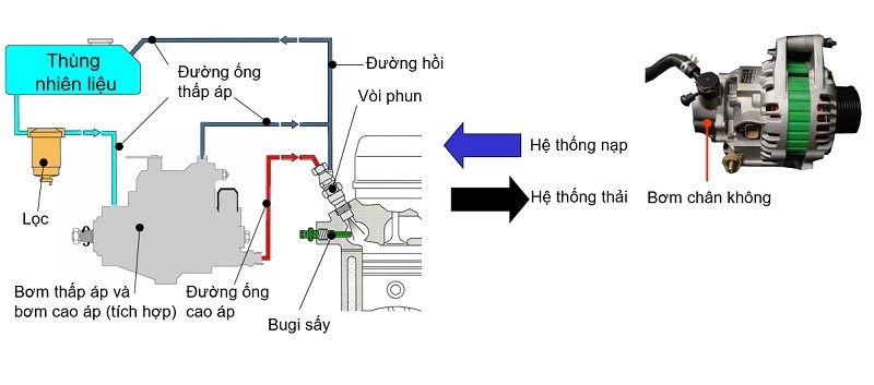 - Hệ thống sấy nóng động cơ khi khởi động (Bugi sấy, hệ thống điều khiển)