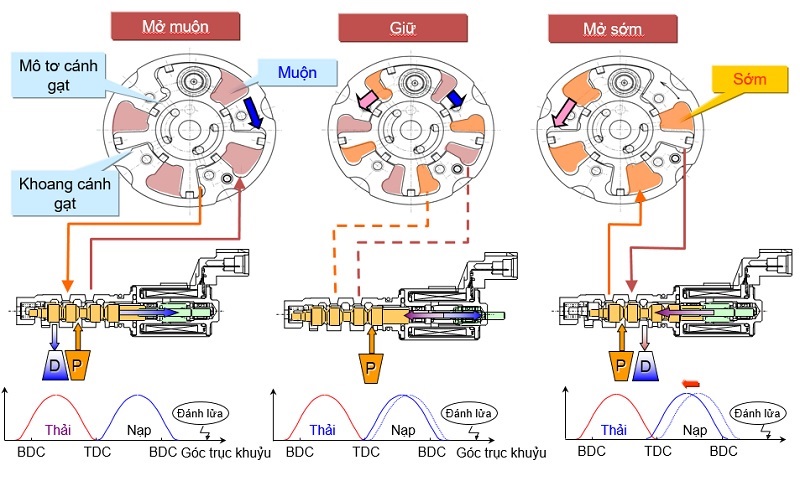- Tại tốc độ cao, tải cao: Mở muộn để cải thiện công suất động cơ.