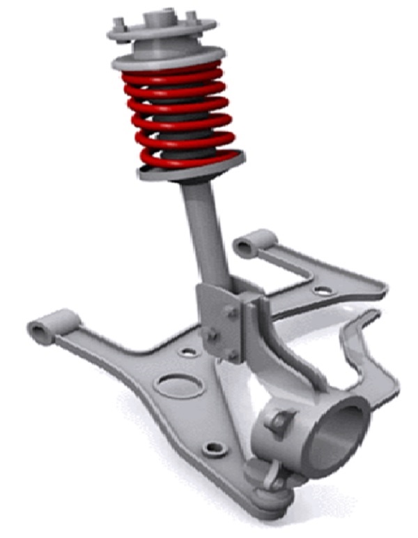 Hệ thống treo Macpherson sẽ đỡ toàn bộ khối lượng của xe. Trên hình vẽ bạn khó nhìn thấy ống giảm chấn vì nó nằm bên trong lò xo. Rô tuyn lái được nối vào thân bên dưới của giảm chấn hoặc vào một cần được hàn vào thân của giảm chấn.