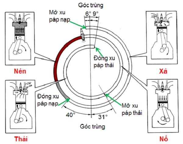 Hoạt động của xu páp được biểu diễn bằng biểu đồ hoạt động theo góc. Thời điểm đóng và mở của mỗi xu páp được xác định bằng góc hoạt động của cam. Góc trùng là thời điểm cả xu páp nạp và xu páp thải đểu mở. Góc trùng giữ một vai trò quan trọng trong hoạt động của động cơ. Nếu góc trùng quá bé động cơ sẽ có chế đoọ chạy không tải êm và mô men xoắn lớn ở tốc độ thấp nhưng động cơ không đạt được tính năng hoạt động tốt ở tốc độ cao. Góc trùng lớn thì ngược lại, động cơ sẽ có tính năng hoạt động tốt ở tốc độ cao nhưng không tốt ở tốc độ thấp