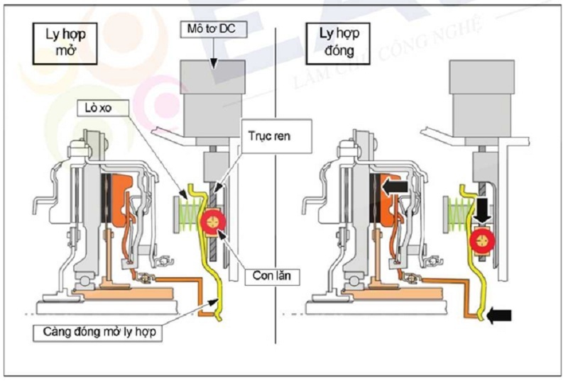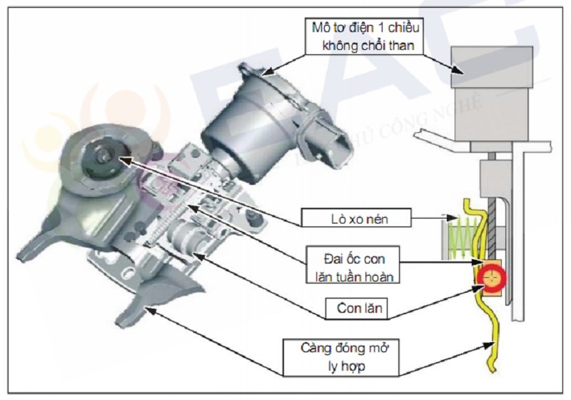 Mô tơ điện một chiều không chổi than được lắp lên vỏ của hộp số. Mô tơ dẫn động trực tiếp thanh ren của vít-me. Nhờ cơ cấu vít-me, chuyển động quay của mô tơ thông qua cơ cấu thanh ren sẽ biến thành chuyển động tịnh tiến của trục con lăn. Kết quả mô men quay của mô tơ chuyển thành lực tác động vào điểm giữa của càng đóng mở ly hợp và giúp càng đóng mở ly hợp tác động vào lò xo ép thông qua ống trượt.