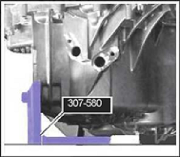 Trước khi bắt đầu làm việc với bộ ly hợp kép, hộp số cần được cố định với dụng cụ chuyên dùng 307¬580. Dụng cụ chuyên dùng này sẽ giữ hộp số trên bàn sửa chữa với trục sơ cấp của hộp số hướng lên trên