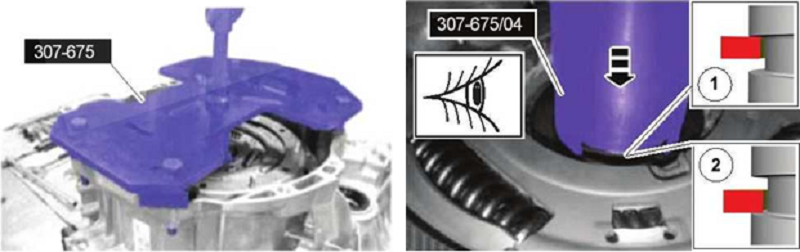 LƯU Ý: Có thể phải xoay bộ ly hợp kép để dụng cụ 307-675/2 được đặt đúng rãnh trên vỏ hộp số.