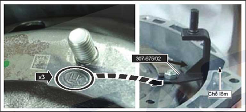 6. Sau khi tháo hai phe chận, dụng cụ 307-675/2 phải được lắp vào 3 bu lông tại vị trí có ký hiệu “LUK”.