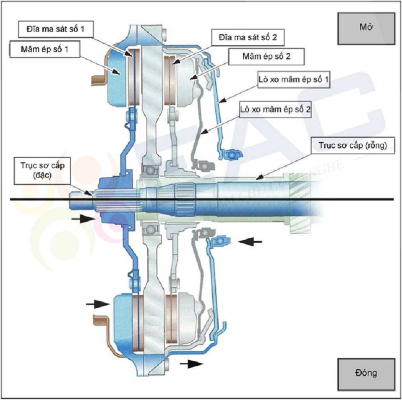 Mô men xoắn của động cơ truyền thông qua một trong hai đĩa ma sát được lắp song song đến cấp số chẵn, lẽ tương ứng. Vì lý do an toàn, bộ ly hợp được thiết kế thường mở. Kiểu ly hợp này gọi là ly hợp chủ động “active clutch”. Trên kiểu ly hợp chủ động, áp lực của mâm ép lên đĩa ma sát sẽ bằng 0 nếu không có lực tác động hoặc chỉ có lực tác động nhỏ lên đòn bẩy của mâm ép.