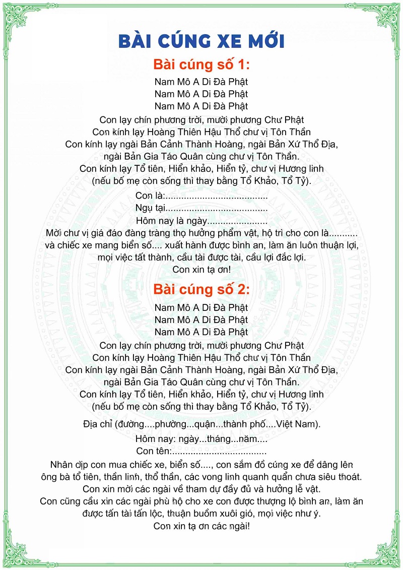 Bài cúng xe mới số 1 và Bài cúng xe mới số 2