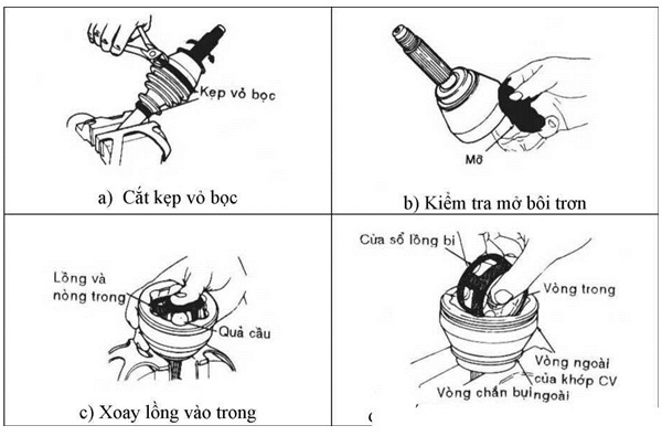Để xem sét khớp đồng tốc ngoài, tháo kẹp của vỏ bọc (hình a) rồi tháo vỏ bọc. Lấy một ít mỡ bôi trơn từ khớp đặt lên ngón tay của bạn và miết hai ngón tay vào nhau (hình b). Nếu cảm thấy có chất lợn cợn như có cát thì khớp đồng tốc đã bị hư hỏng. Lau chùi mỡ và tháo khớp đồng tốc ra khỏi nửa trục. Tháo các viên bi và vòng ổ bi ra khỏi khớp (hình c,d).