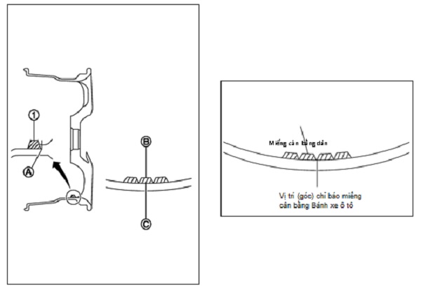Khi lắp miếng kẹp chì cân bằng lốp vào các bánh xe đặt nó vào phần có rãnh trên thành phía trong của Bánh xe ô tô như hình vẽ để phần giữa của miếng kẹp chì cân bằng lốp được căn thẳng với vị trí (góc) chỉ báo trên máy cân bằng Bánh xe ô tô