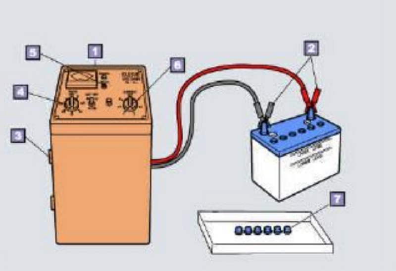(Chú thích: 1. Máy nạp ắc-quy; 2. Kẹp nạp; 3. Bộ ngắt mạch; 4.Công tắc thời gian; 5. Đèn báo nhầm cực; 6. Bộ điều chỉnh dòng; 7. Nút thông hơi)