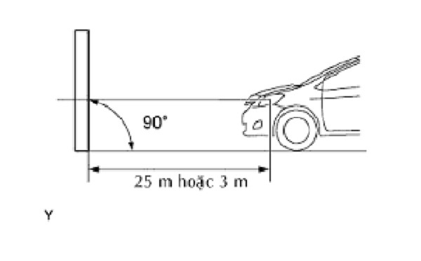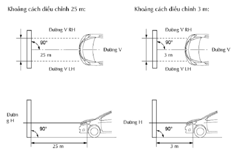 Khoảng cách giữa xe (tâm bóng đèn pha) và tường phải là 25 m để chỉnh đúng độ hội tụ. Nếu không thể đạt được khoảng cách 25 m (82 ft), thì đặt khoảng cách đúng 3 m (9.84 ft) để kiểm tra và điều chỉnh độ hội tụ đèn pha. (Vì vùng mục tiêu thay đổi theo khoảng cách, hãy tuân theo các chỉ dẫn như trong hình vẽ.)