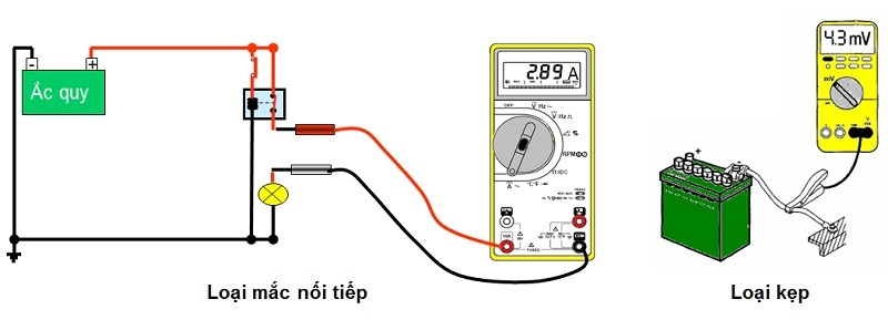 Ampe kế loại cặp: Là một trang bị bổ xung và tùy chọn cho đồng hồ số, nó thường dùng để đo dòng điện lớn hơn và thường để kiểm tra hệ thống nạp và khởi động.