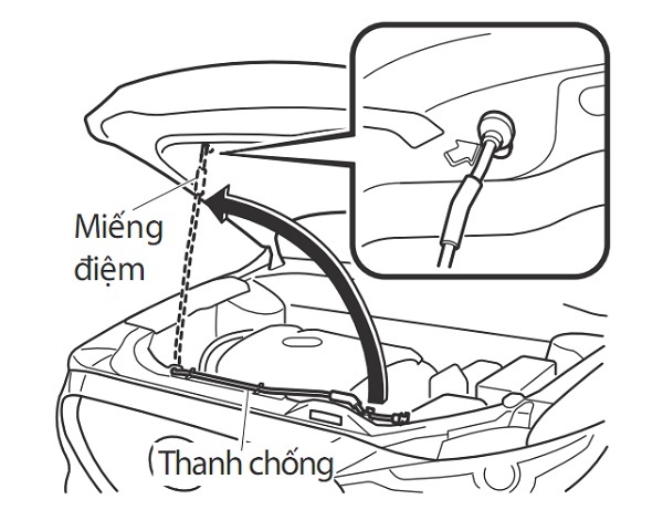 3. Nắm thanh chống ca-pô ở vị trí có miếng đệm và đặt nó đúng vị trí lỗ được chỉ bởi mũi tên trên nắp ca-pô để giữ ca-pô