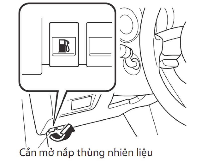 Để mở nắp thùng nhiên liệu hãy kéo cần mở. Để đóng nắp thùng nhiên liệu hãy đẩy nắp cho đến khi nắp được khóa chặt.