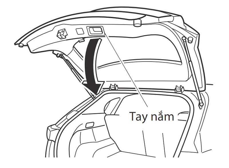 Hạ thấp dần nắp khoang hành lý xuống bằng cách kéo tay nắm, sau đó sử dụng cả hai tay đẩy cửa hậu để đóng lại.