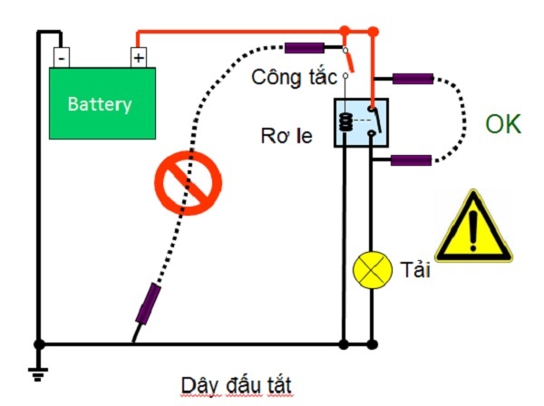 Sử dụng dây đấu tắt rất hữu dụng để kiểm tra hệ thống điện. Nó dùng để kiểm tra hoạt động của mạch điện, tìm kiếm và cách li các thiết bị bị lỗi (công tắc, rơ le… bằng cách đấu tắt qua thiết bị). Khi sử dụng dây đấu tắt cần lưu ý: