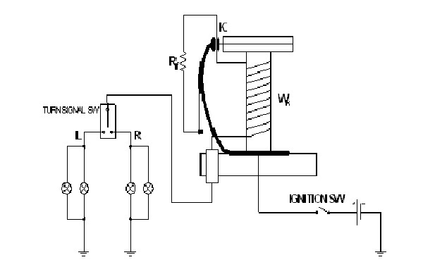 Cực dương ắc quy accu -> SW-> dây điện trở Rf -> K -> W -> L-> đèn -> mass. Lúc này dòng qua bóng đèn phải qua dây điện trở và điện trở phụ nên đèn không sáng, nhưng nó làm dây điện trở nóng lên, chùng ra, làm mặt vít k đóng lại cho dòng lớn qua đèn, làm đèn sáng lên. Lúc này dây điện trở và điện trở phụ bị ngắn mạch nên nó nguội đi co lại, mặt vít K mở, đèn tắt. Tần số đóng ngắt này được giới hạn trong khoảng 60-120 lần / phút.