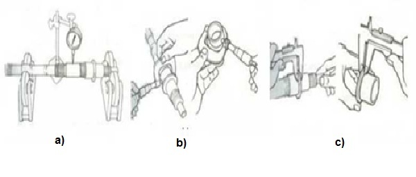 - Kiểm tra: dùng thước cặp, pan me, đồng hồ so để đo độ mòn, cong của trục (độ mòn, cong không lớn hơn 0,05 mm) và phanh hãm (hình. 4 -2), và dùng kính phóng đại để kiểm tra các vết nứt của trục.