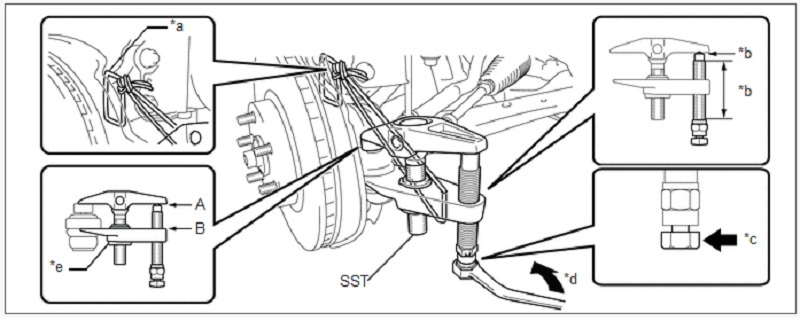 ·Lắp SST bằng đai ốc định tâm để A và B song song như hình vẽ. Nếu không, nắp chắn bụi khớp cầu có thể bị hỏng.