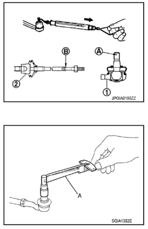 1. Nới lỏng đai ốc khóa rô-tuyn lái ngoài, và tháo rô-tuyn lái ngoài.