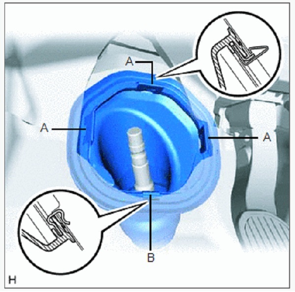 a. Tháo 3 kẹp (A), nhả khớp kẹp (B) ra khỏi thân xe và tháo nắp che lỗ trục lái số 1.