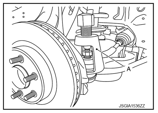 5. Tháo rô tuyn lái ngoài ra khỏi khớp nối hệ thống lái để không làm hỏng vỏ cao su chắn bụi khớp cầu bằng vam tay (A) (STT: ST29020001).
