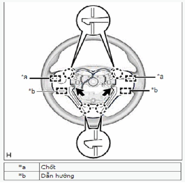 a.Cài khớp 4 vấu hãm, 2 chốt và 2 vấu dẫn hướng để lắp cụm lẫy chuyển số trên mặt vô lăng vào cụm vô lăng.