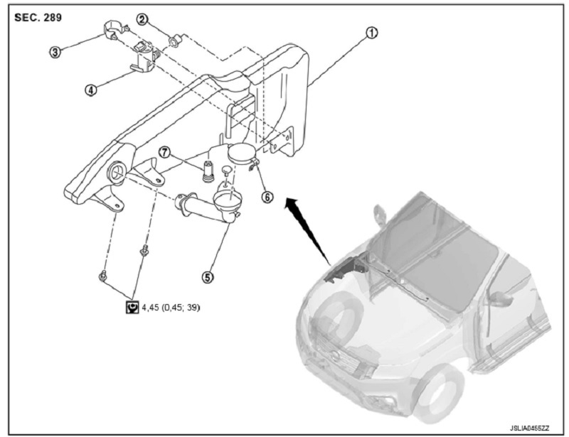 4. Ngắt đầu nối bơm nước rửa kính trước (2) và đầu nối công tắc mức nước rửa kính.