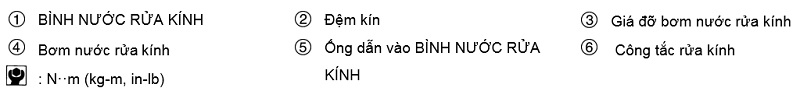 LƯU Ý: Sau khi lắp và nước đạt đến mức trên của ống dẫn vào BÌNH NƯỚC RỬA KÍNH và kiểm tra xem nước bị rò rỉ không.