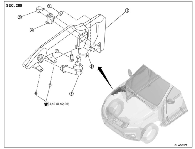 1. Tháo BÌNH NƯỚC RỬA KÍNH. Tham khảo WW-51, "Tháo và Lắp".