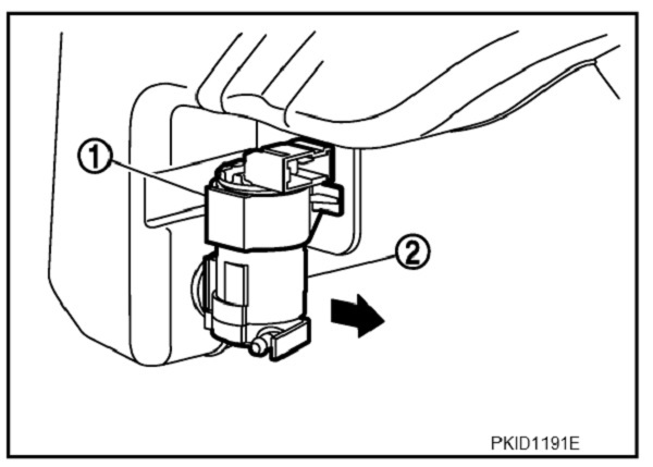 3. Kéo bơm nước rửa kính (2) ra theo chiều ngang như hình vẽ hiển thị Tháo bơm nước rửa kính ra khỏi BÌNH NƯỚC RỬA KÍNH.