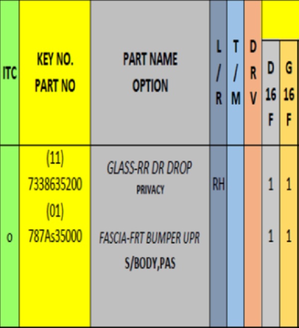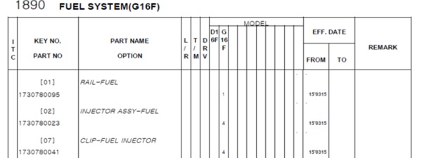 Trong hình chúng ta có thế thấy cột có biểu tượng D16Fnghĩa là máy dầu và cột G16F nghĩa là máy xăng và chi tiết là 1 nghĩa là số lượng chi tiết phụ tùng dùng trong 1 xe là 01 chi tiết.