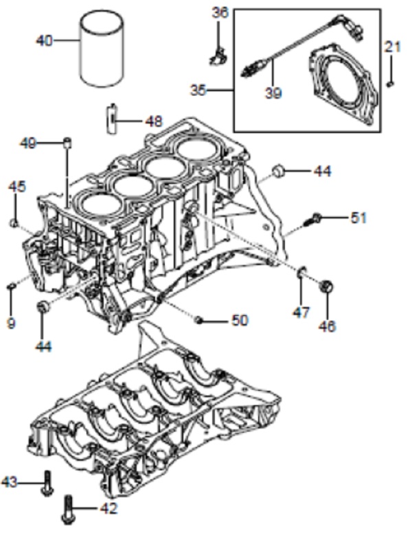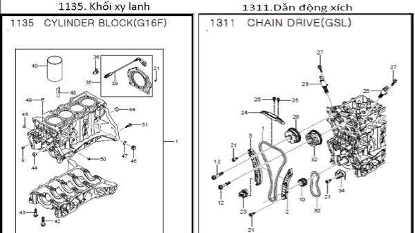 Ví dụ:hình ảnh bên phải là một cụm phụ tùng(cylinder block-khối xi lanh) và trong cụm có nhiều các chi tiết nhỏ liên quan đến khối xi lanh như: chi tiết 43 là ốc vít xi lanh,chi tiết 40 là ống lót xi lanh…