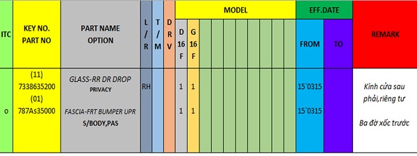 Trên đây là bảng thể hiện đầy đủ phạm vi áp dụng của phụ tùng. Trên bảng thể hiện đầy đủ danh mục tên phụ tùng,mã số phụ tùng,vị trí,khả năng đổi lẫn,ngày tháng…