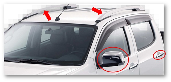 D-max được trang bị Baga mui thể thao tiêu chuẩn. Gương chiếu hậu 2 bên mạ crôm, tích hợp gập điện và chỉnh điện.Tay nắm cửa hông và đuôi xe được mạ crôm