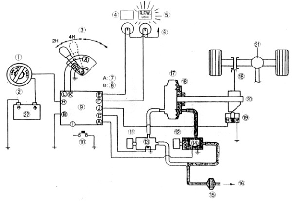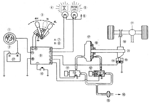 Khi cần gài cầu chuyển từ 4H (ứng với 4H – L trong bộ điều khiển) đến 2H “Lock”, công tắc đèn cảnh báo 4 x 4 trong hộp số phụ chuyển từ OFF sang ON. Nếu công tắc chính RFW ở vị trí OFF, chương trình 2H – L được thiết lập, van từ “Lock” duy trì ở vị trí ON bộ thừa hành nằm ở vị trí khóa.