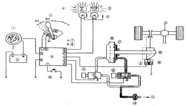 1. Bộ điều khiển khóa moay ơ (RFW) nhận tín hiệu từ một công tắc của hộp phân phối và một vài công tắc khác. Sau đó nó điều khiển một trong hai van từ hoạt động làm cho chân không đi từ bơm chân không đến bộ thừa hành điều khiển cơ cấu khóa moay ơ thực hiện khóa hai bánh xe trước với hộp vi sai cầu trước hay để nó quay tự do.