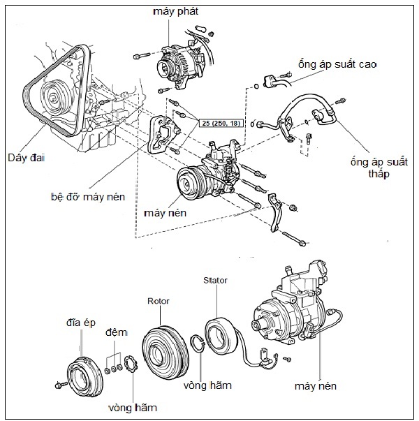 - Đo khe hở giữa đĩa áp lực và pu-ly lốc điều hòa (0.5mm). Nếu ngoài giá trị đó thì thêm sim.