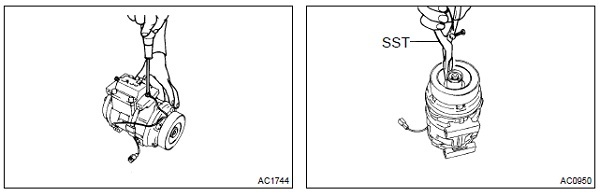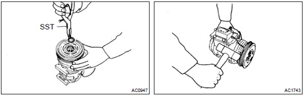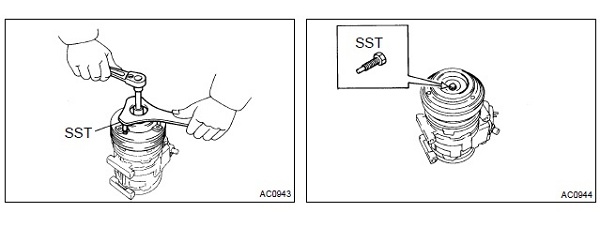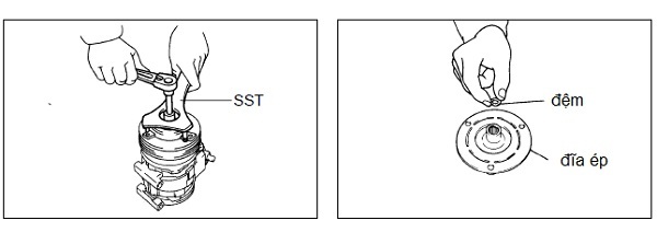 Bước 2: Dùng SST và chìa vặn mân cặp để tháo đĩa ép ly hợp lốc điều hòa.