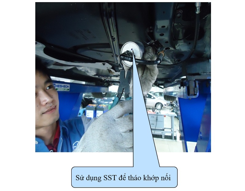 * Nâng cầu đến vị trí trên cao, dùng dụng cụ SST để tháo khớp nối đường ống