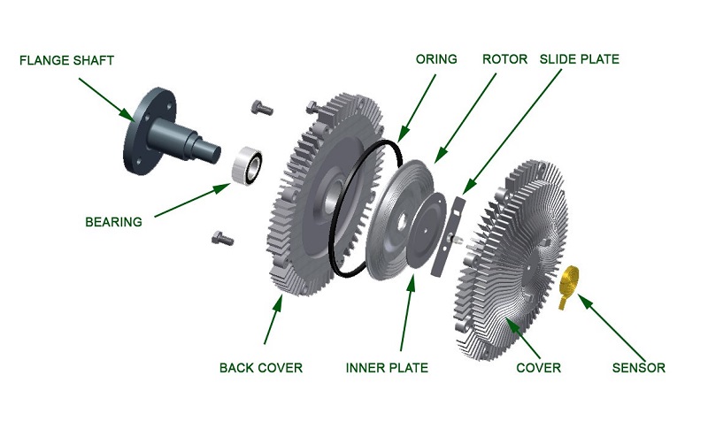 - Khi nhiệt độ nước làm mát tăng cao, nhiệt độ gió đi qua két nước cũng tăng. Tấm lưỡng kim trong ly tâm quạt sẽ bung ra và van sẽ xoay để cho dầu đi vào khoang làm việc