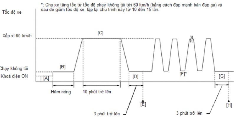 14.Hãy để xe tăng tốc từ tốc độ chạy không tải tới khoảng 60 km/h và sau đó giảm tốc độ xe, lặp lại chu trình này từ 10 đến 15 lần [F].