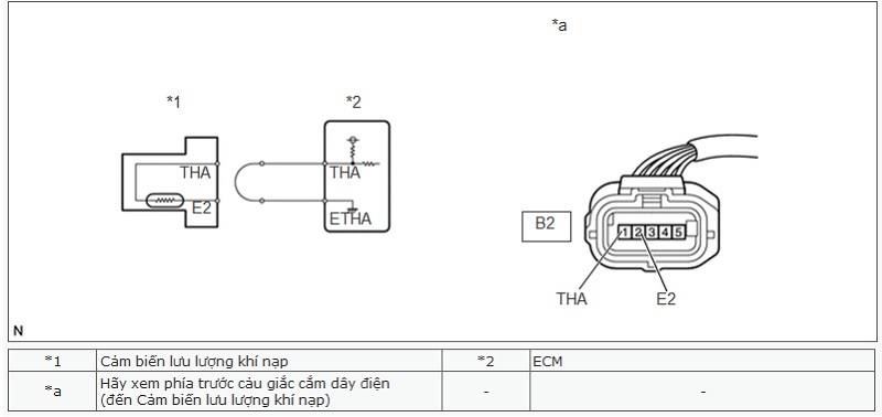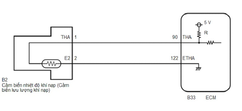 Cảm biến nhiệt độ khí nạp (IAT) được cấp nguồn 5 V từ cực THA của ECM, qua điện trở R.