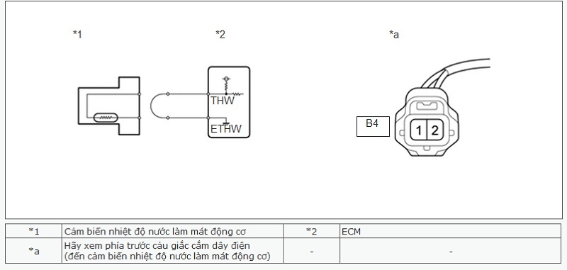 ·Hở mạch hay ngắn mạch trong mạch cảm biến nhiệt độ nước làm mát động cơ ·Cảm biến nhiệt độ nước làm mát động cơ ·ECM |